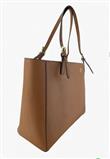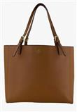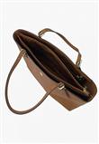 Possui alças de ombro, tipo tote, tamanho médio, cor caramelo, ferragens douradas, bolsos abertos e fechados com zíper por dentro.