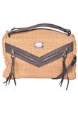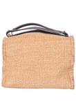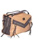 Possui fechamento em zíper, alça de mão e alça transversal.