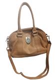 Possui fechamento em zíper, ferragens douradas e um enfeite com o logo da marca também dourado.