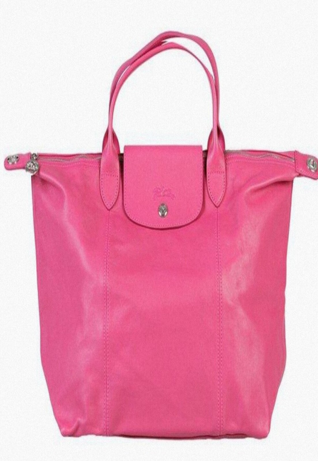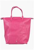 Possui alça de ombro e alça transversal, toda em couro rosa.