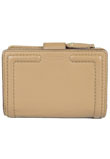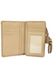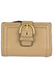 Possui fecho em fivela e zíper. Possui vários compartimentos.