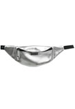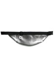 Possui acabamento metalizado, dois compartimentos com fecho em zíper, faixa ajustável e fecho em fivela de encaixe.