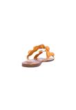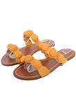 Traz duas tiras cobertas por esferas resinadas amarela, sobre os dedos e peito do pé.