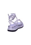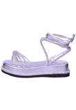 O modelo tem salto baixo e bico redondo, tiras em torno do calcanhar e tornozelo.