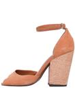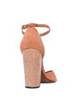 Em camurça, possui salto tijolo com acabamento em ráfia e fechamento por fivela.Salto: 10cm