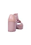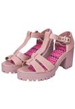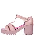 Possui salto baixo, base tratorada e bico redondo. Traz tiras grossas no cabedal, cobrindo parte dos dedos e do peito do pé, sendo uma central, que segue até o tornozelo e tem detalhe em peças metálicas, e as demais horizontais. Possui ainda tiras em torno do calcanhar e do tornozelo, fechando em fivela lateral.