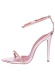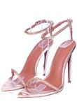 Possui salto alto fino, tira fina sobre os dedos e tira que contorna o tornozelo e fecha em fivela metálica.