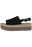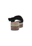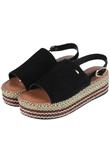 Com salto flatform em corda com detalhe metalizado dourado, cabedal em camurça com fechamento posterior com fivela dourada.