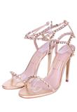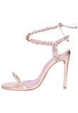 Possui salto alto fino, tira fina sobre os dedos e tira que contorna o tornozelo.