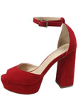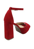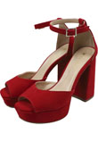 Possui cabedal aveludado, fecho em zíper, salto grosso e meia-pata.