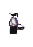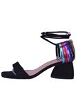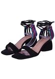 Possui salto bloco e bico redondo, tira média sobre os dedos e tiras no calcanhar fechando em amarração no tornozelo.