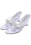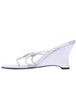 Possui divisor de dedos, salto anabela, acabamento metalizado e aplicações decorativas. Salto: 8cm.