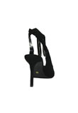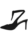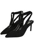 Acabamento em suede e modelo sling back com transpasse e amarração no tornozelo.