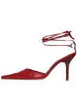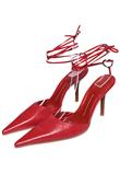 Possui tiras para amarração no tornozelo e cabedal estilo mule. Salto: 10cm.