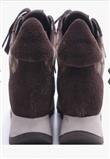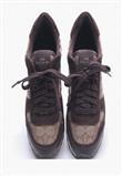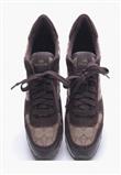 Possui fechamento em cadarço, com tecido monogramado da marca e camurça marrom.