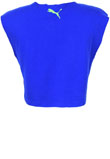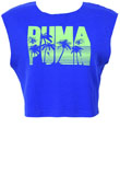 Estampa neon frontal, decote redondo, altura cropped, barra mullet.
