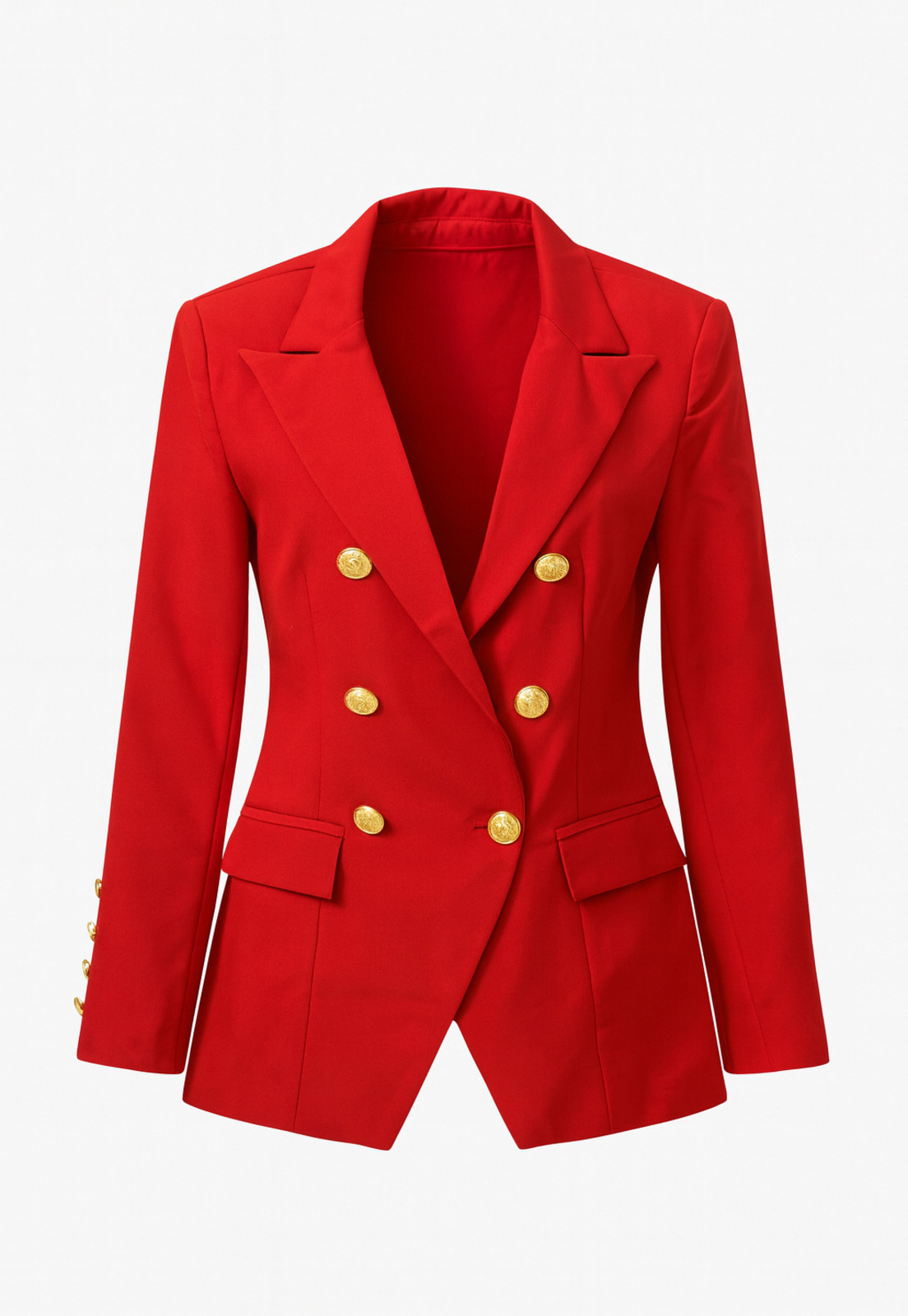 Possui ombreira, fechamento em botão e bolsos falsos.