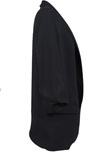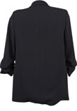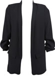 Possui ombreiras, mangas 3/4 com drapeado e gola xale.