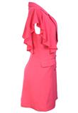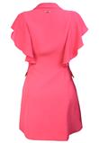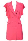 Possui fechamento em botão, bolsos e babados em forma de manga.
