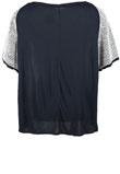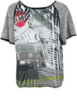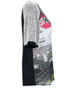 Possui estampa frontal, mangas raglan com acabamento em tricot.