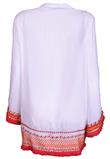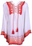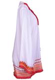 Possui decote com amarração frontal, bordados e franjas decorativas.