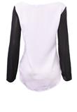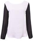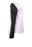 Possui duas cores, preto nas mangas e branco no corpo da peça.