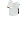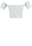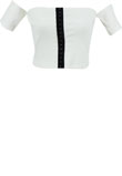 Possui padronagem canelada, decote ciganinha e detalhe frontal em colchetes.