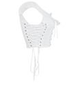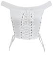 Possui decote ombro a ombro com ajuste em elástico, fecho em zíper e transpasses decorativos.
