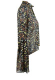 Com transparência, sem forro, possui gola alta com babados, fecho posterior em botão e estampa floral.