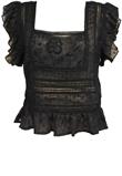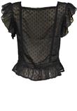 Possui decote quadrado, recortes em guipir, barra e manga com babados e bordado frontal. Confeccionada em tecido com leve transparência e padronagem de poásOmbro: 7cm/ Manga: 6cm/ Busto: 88cm/ Comprimento: 47cm
