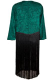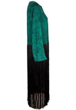 Possui detalhe em franjas e fecho em botões na parte de trás