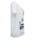 Possui gola redonda e estampa frontal. Ombro: 17cm/ Manga: 7cm/ Busto: 110cm/ Comprimento: 62cm