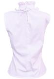 Possui gola alta e fechamento em botão.