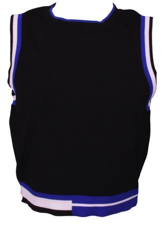Possui gola redonda e sem mangas.