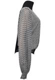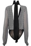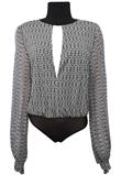 Com estampa geométrica, possui mangas longas, costas abertas e gola alta com amarração posterior.Ombro: 12cm/ Manga: 73cm/ Busto: 88cm/ Comprimento: 81cm