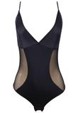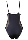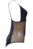 Cós elástico, alça regulável, detalhes em transparência e fecho entre pernas.