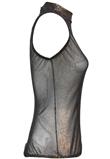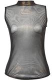 Body dourado com brilho em tule transparente, sem manga e com gola alta.