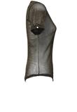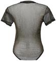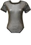Body com gola redonda e manga curta, em tule com brilho dourado.