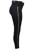 Confeccionada em sarja com elastano, possui detalhe em pedraria nas laterais, bolsos dianteiros e traseiros e fechamento por zíper e botão.Cintura: 76cm/ Quadril: 92cm/ Gancho: 27cm/ Comprimento: 99cm