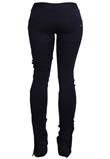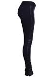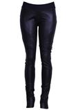 Possui zíper, detalhes de couro, elástico na cintura e bolsos.