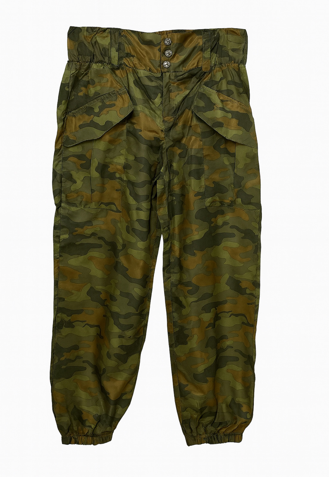 Possui fechamento em botão triplo, ziper, bolsos laterais e elático na barra.
