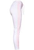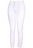 Cós elástico, fecho em amarração, detalhe de faixa na lateral, não possui bolso.