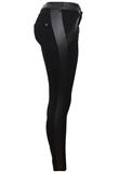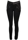 Possui recortes em couro ecológico, bolsos traseiros e fechamento por zíper e botão.Cintura: 70cm/ Quadril: 88cm/ Gancho: 25cm/ Comprimento: 95cm