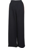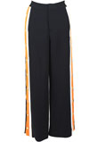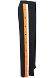 Possui cós elástico, fecho em zíper e colchetes, faixas laterais contrastantes e fecho em botões.