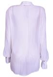 Possui fechamento em botão e amarração no pescoço. Tecido transparente e não possui forro.