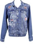 Possui fecho por botões, bolsos, acabamento destroyed e aplicações de patches.