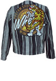 Estampa vertical, fecho em zíper frontal, bolso frontal, estampa atrás com aplicação de patch, pequenas marcas na estampa.