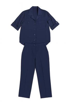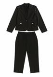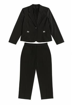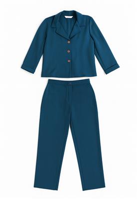 Possui blazer e calça , e no blazer tem aplicações com brilho nos bolsos