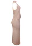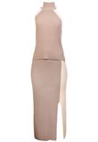 Conjunto composto por saia e regata. Regata possui gola alta. Saia possui cós elástico e fenda.