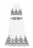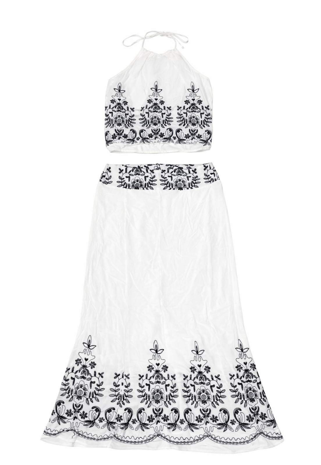 Conjunto composto por blusa e saia. Blusa possui elástico na barra e amarração no pescoço. Saia possui forro e zíper.
